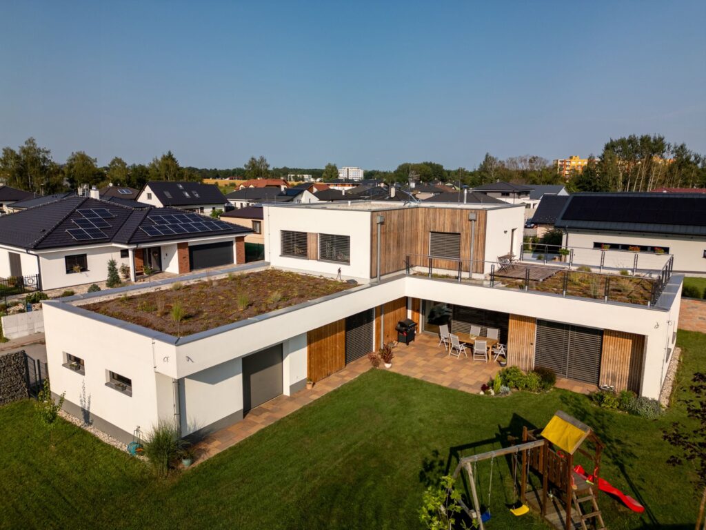 Konstrukce: zdivo Porotherm 44 T Profi, střecha je izolovaná fólií Fatrafol, okna Vekra Komfort EVO, venkovní dlažba Semmelrock Bradstone Old Town (měděnohnědá)