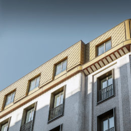 Historický dům v centru Vídně nedávno změnil svoji podobu, dostal nový, nevšední kabát. Impozantní dojem vyvolává zvláště zlatá hliníková střecha, která se ve slunečních paprscích působivě blyští. Tak dokonalého optického efektu bylo možné dosáhnout jen díky hliníkovým šablonám PREFA. Úkolem projektu bylo zachovat historický ráz budovy, ale přitom ji symbolicky přesadit do současného pojetí architektury. […]