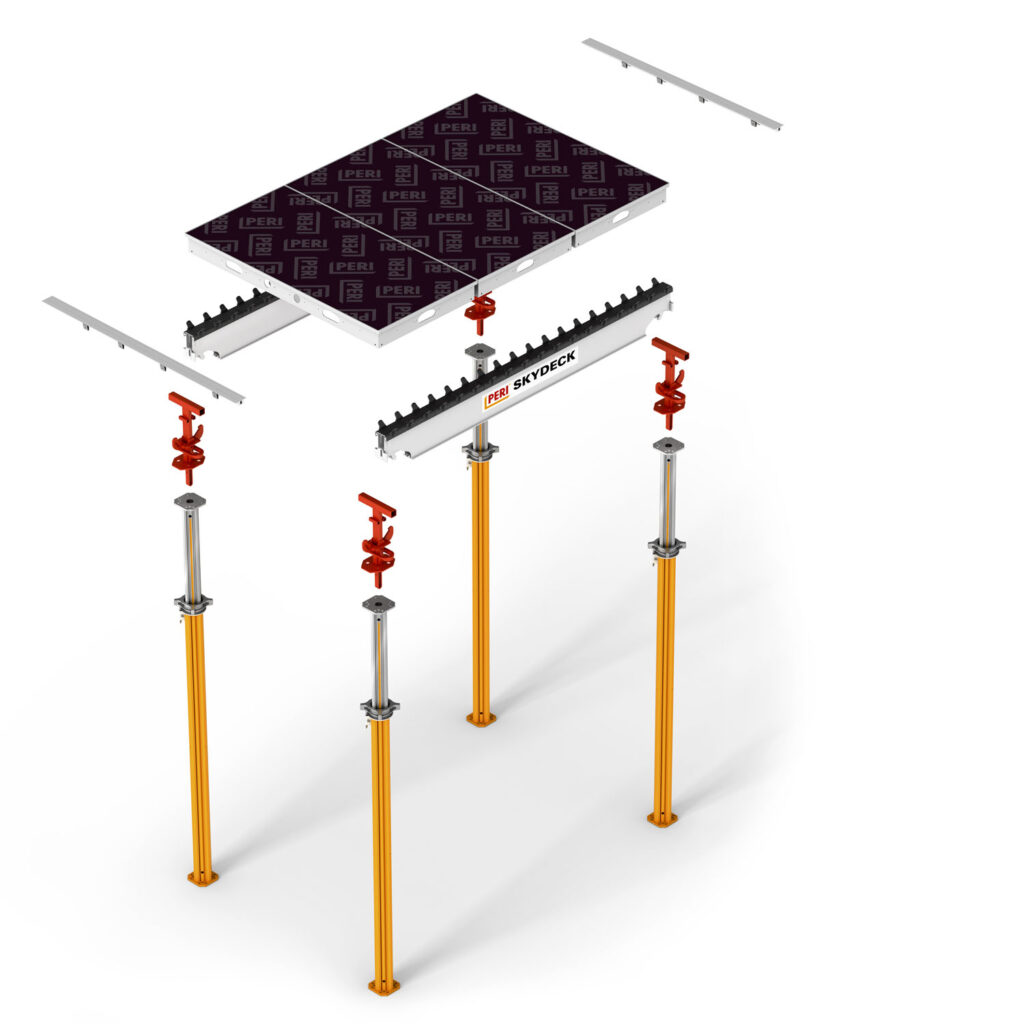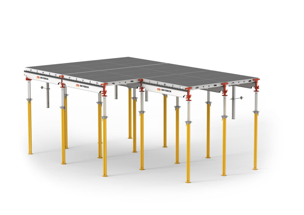 PERI SKYDECK je panelové stropní bednění s lehkými hliníkovými systémovými díly včetně pláště bednění pro zhotovení stropních desek do tloušťky 109 cm. Může být nasazeno od bytové až po průmyslovou výstavbu. S rozsáhlým příslušenstvím je toto stropní bednění vhodné také pro projekty s vysokými standardy bezpečnosti. SKYDECK znamená snadnou práci bez velké námahy a tím rychlé a bezpečné bednění se systematickým postupem montáže. Promyšlená konstrukce s padací hlavou umožňuje časné odbednění a snižuje množství potřebného materiálu. Potřeba malého množství stojek usnadňuje pohyb pod stropním bedněním a snadné přemisťování materiálu.