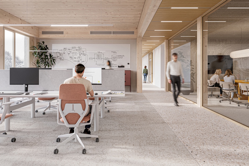 Administrativní budovy BLOCK stojí na promyšlené hybridní konstrukci, která kombinuje těžký dřevěný skelet, CLT panely a sofistikované žebrové stropní prvky NOVATOP s lehkým obvodovým pláštěm z vysoce prefabrikovaných panelů NOVATOP. Železobeton je přitom využit jen tam, kde má své nezastupitelné místo. Jedním z největších benefitů systému BLOCK je vysoký podíl přiznaného dřeva v interiéru. Tento klíčový architektonický prvek představoval největší technickou výzvu z hlediska akustiky, požární bezpečnosti a integrace systémů vytápění, větrání a chlazení. Díky sofistikovanému řešení je vše plně zakomponováno do konstrukce, což umožňuje naplno vyniknout čistému designu.