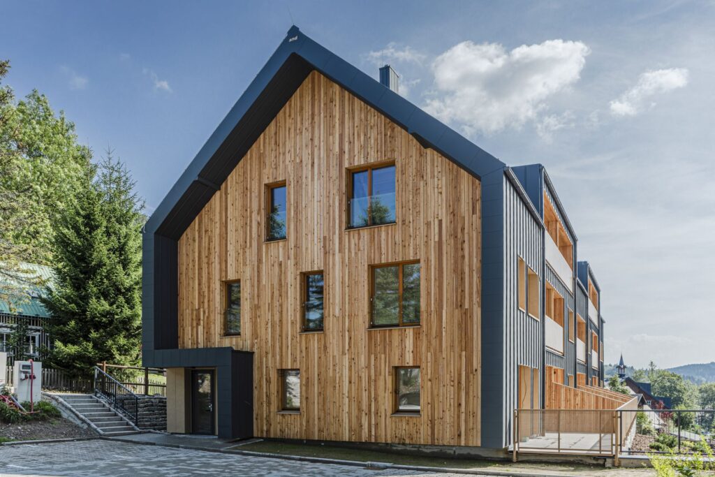 Horské prostředí klade na výstavbu budov vysoké nároky, a to zejména náročným klimatem a mnohdy i specifickou architekturou. Horské stavby musí být navrženy s maximální precizností a hlubokou znalostí místních podmínek, aby mohly dlouhodobě odolávat proměnlivým klimatickým vlivům. Klíčovou roli v tomto ohledu hrají efektivní materiály, které slouží jako první obranná linie proti nepřízni počasí. To platí dvojnásob v náročném prostředí Jizerských hor, kde vznikly Apartmány Padesátka v Bedřichově. Na první pohled zaujmou kombinací dřevěných prvků a vnějších konstrukcí opláštěných falcovaným plechem. Projekt ateliéru Podlipný Sladký Architekti tak spojuje architektonickou citlivost s technickou odolností.