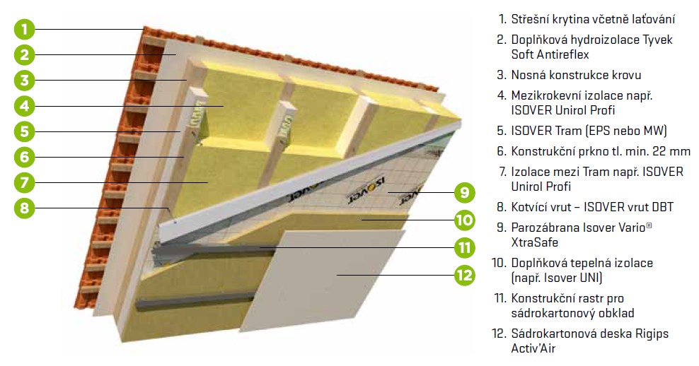Dle stávající, již končící, normy ČSN 73 0540-2:2011 je možné, zateplit rekonstruované podkroví izolací v celkové tloušťce 240 mm. Ovšem v případě novostaveb už nyní platí (dle vyhl. 264/2020 Sb.), že minimální tloušťka zateplení šikmé střechy by měla být v rozmezí 280–320 mm. S aktualizovanou normou však přijde i změna doporučených hodnot, kdy se bude tloušťka zateplení podkroví pohybovat od 320 mm a více. Bude proto již velice složité, vytvořit takové podkonstrukce pod krokvemi, abychom měli takovou tloušťku kam vměstnat. Pro představu, aktualizovaná norma doporučuje u pasivních domů součinitel prostupu tepla šikmé střechy U = 0,1 W/m2K, čemuž odpovídá tl. izolace 410 mm.