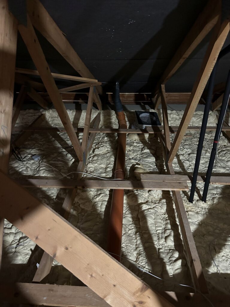 Laboratorní testy potvrdily, že tepelná vodivost si udržela hodnotu 0,038 W/m·K tedy stejnou, jakou měla izolace v době aplikace. Termovizní snímky přitom jasně ukázaly, že strop izolovaný pěnou H2Foam Lite nepropouští teplo ani v místech spojů s krokvemi. „To je přesně moment, který odlišuje kvalitní izolaci od průměrné. V praxi totiž právě v těchto detailech vznikají tepelné mosty, které snižují účinnost i drahých materiálů,“ vysvětluje L. Kmenta.
