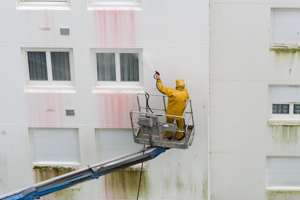 Ideálně pomocí vysokotlakého zařízení s teplou vodou a se speciální tryskou, případně párou. Čisticí prostředek by měl být vhodný pro fasády a maximální tlak vody by neměl překročit 60 barů, aby nedošlo k poškození. Následně se fasáda důkladně opláchne a nechá zcela vyschnout.