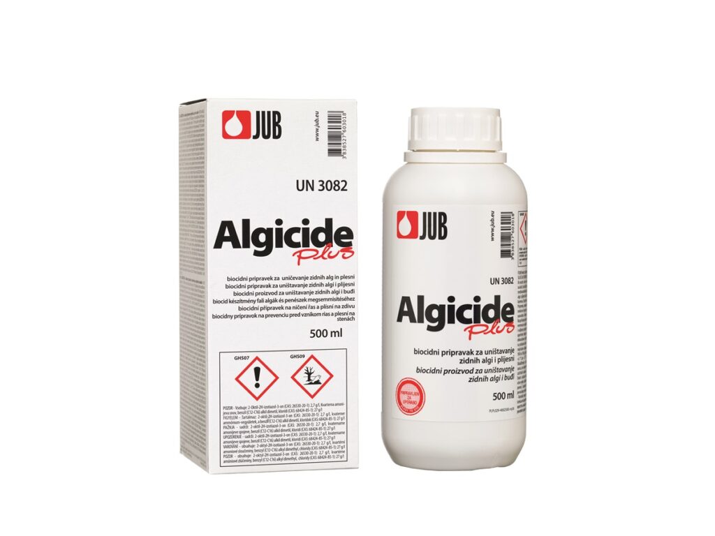 K odstranění mikroorganismů se používá bezbarvý biocidní přípravek JUB ALGICIDE Plus, který proniká hluboko do podkladu a ničí široké spektrum řas a plísní. Neobsahuje chlor, nezatěžuje podklad solí a aplikuje se zředěný vodou v poměru 1 : 4. Nanáší se štětcem nebo válečkem, u silně zasažených ploch se doporučuje aplikace dvou vrstev. Tento přípravek se neoplachuje a po zaschnutí není zdraví škodlivý.