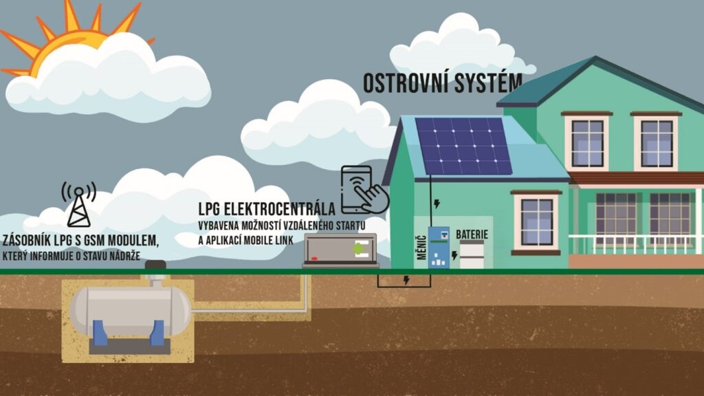Místo drahého navyšování bateriového úložiště padla volba na plynovou elektrocentrálu napojenou na stávající zásobník propanu (LPG). Kapalný propan je běžnou alternativou zemního plynu tam, kde není v dosahu distribuční síť. Podle Jiřího Karlíka, odborníka na LPG a generálního ředitele společnosti Primagas, jsou asi tři čtvrtiny nových odběratelů topného propanu domácnosti po odstávce starého kotle na uhlí.