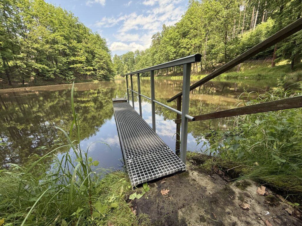 Správci lesní obory u Hluboké nad Vltavou potřebovali letos v květnu obnovit obslužné lávky k požerákům u pěti rybníků. Přístup k rybníkům je velice omezený, jsou vzdálené od lesní cesty a terén je místy extrémně svažitý. Způsob dopravy, manipulace s lávkami, jejich instalace a také jejich dlouhá životnost hrály důležitou roli při volbě konstrukčního materiálu.