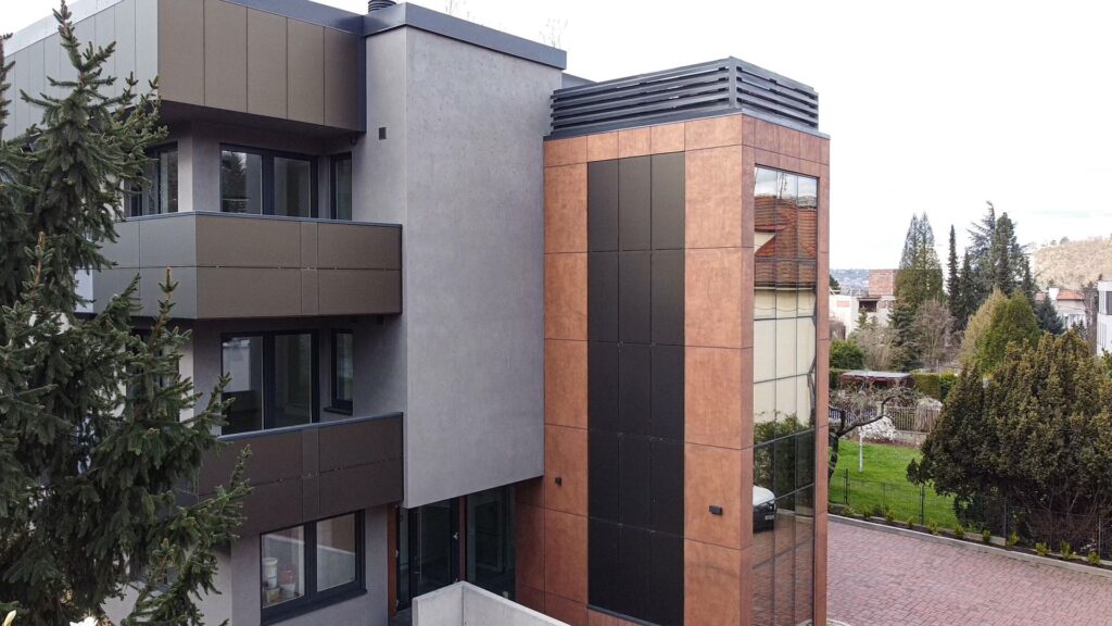 Ale vraťme se k realizaci domu v Holešovičkách. Různě hrubé až hladké povrchy fasády jsou tedy dány nejen zrnitostí omítky, ale též použitým nástrojem. V případě struktury zvoleného pohledového betonu se kombinovala omítka Baumit CreativTop Vario a v některých místech také její jemnější verze Baumit CreativTop Silk. Požadovaného vzhledu betonu bylo poté dosaženo dvoufázově za použití nerezového hladítka. Po zabroušení povrchu excentrickou bruskou následovala aplikace finálního nátěru Baumit Lasur v požadovaném odstínu. U povrchové struktury evokující zrezivělý plech à la korten byla základem omítka Baumit CreativTop Fine. Po jejím zaschnutí se následně natáhla druhá vrstva o silnější tloušťce za použití omítky Baumit CreativTop Pearl. Pomocí malířského válečku s vlasem se následně docílilo základní podoby povrchu zrezivělého plechu. V určitých místech se poté nerezovým hladítkem vytvořila hladká část struktury plechu. Tím byla vytvořena celková vizuální plasticita požadované struktury. Následným přebroušením, použitím celoplošného nátěru disperzní barvou Baumit Metallic Bronze a nakonec nanesením finálního nátěru Baumit Lazur 730L Mystic pomocí houby vznikla na části fasády bytového domu efektní metalická verze zrezivělého plechu.