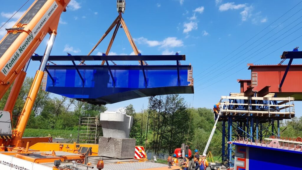 „U mostu máme hotové pilíře a opěry, tedy kompletní spodní stavbu, a aktuálně probíhají práce na ocelové konstrukci. Minulý týden byly na stavbu přivezeny další dva rozměrné komponenty ocelové konstrukce a jeden díl se osazoval do finální polohy,“ popsal stavbyvedoucí Skanska Milan Zigmund. Celkem se na projekt dopraví 26 ocelových dílů z výrobních závodů v Ostravě a Lískovci, ty se na stavbě svaří do finálních 9 dílů, které budou tvořit nosnou konstrukci.