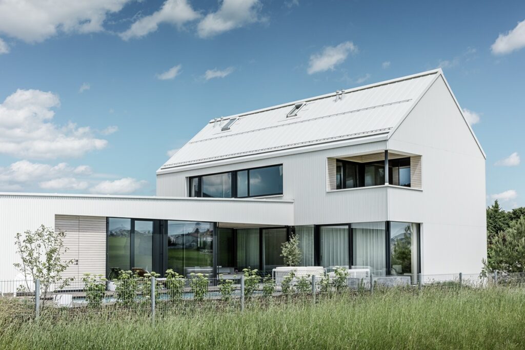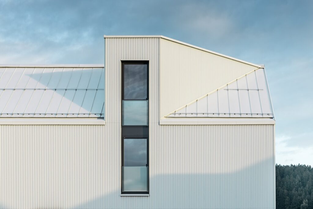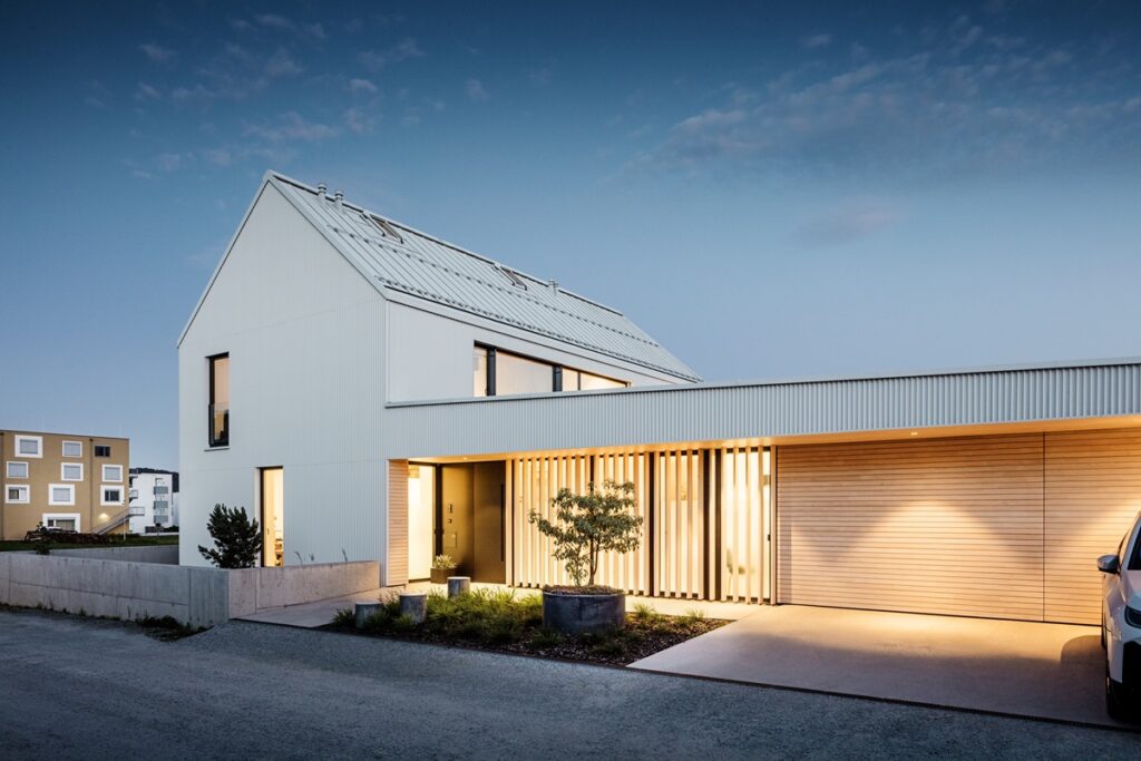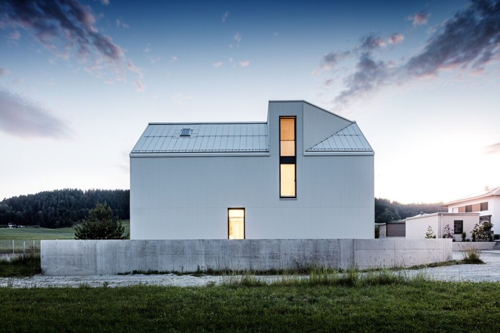 Rodinný dům ve Freistadtu má monolitický tvar, bílou fasádu a na první pohled působí trochu komorně – což byl ale záměr, protože vyrůstal v nové zástavbě rodinných domů a jeho majitelé upřednostňují soukromí. Fasáda není z běžného obkladu ani omítek, ale ze svitkových plechů PREFALZ se speciálně navrženou a individuálně profilovanou hranou. Výsledkem je povrch, který má skutečnou hloubku a který mění svou podobu přesně podle toho, jak na něj dopadá denní světlo.