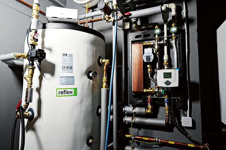 Základem systému je předávací stanice Taconova TacoTherm Fresh Mega X, která slouží k přípravě čerstvé teplé vody průtokovým způsobem. K tomu byl použit 500litrový akumulační zásobník, nabíjený běžným plynovým kotlem o výkonu 49 kW. Díky této kombinaci lze nejen rychle reagovat na okamžitý odběr teplé vody, ale zároveň efektivně hospodařit s prostorem.