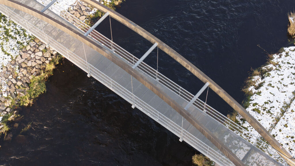 Oblouky z materiálu UHPFRC zajišťují ocelové rozpěry, roštová mostovka slouží jako táhlo oblouku – tyčovými závěsy je zavěšena na konstrukci oblouku, v patě oblouku je s obloukem spojena čepovým spojem.