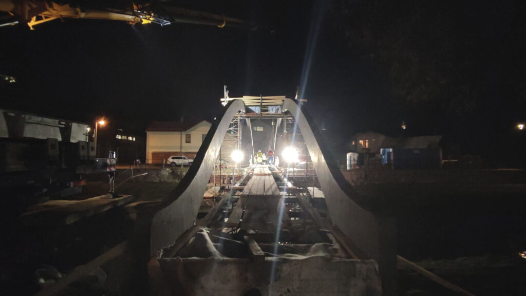 Konstrukce oblouku byla zhotovena jako prefabrikát s montážním spojem ve vrcholu. Vyráběly se tak přesné poloviny dvojice obloukových pasů. Montážní spoj ve vrcholu oblouku se zabetonoval s provázáním výztuže pomocí příložek. V dolní části oblouku (v patě v místě monolitického příčníku) z prefabrikátu vyčnívala výztuž pro spřažení s monolitickými příčníky, zárodky kotev příčného předpětí. Styčná spára byla vystrojena smykovými zámky.