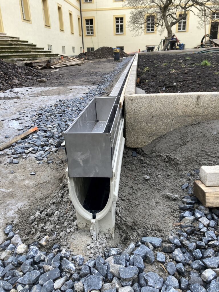 Projekční tým MEA navrhl systém žlabů MEARIN PLUS v kombinaci s nerezovými štěrbinovými nástavci TSL 1000.