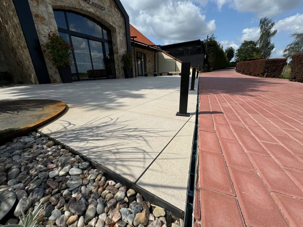 Linie krytu je široká jen dva centimetry. Na první pohled není poznat, že se jedná o odvodnění s velkokapacitním žlabem MEARIN z odolného SMC kompozitu. Naprosto hladký povrch štěrbiny bez ostrých hran a koutů zabraňuje usazování sedimentů a umožňuje velmi rychlé a efektivní čištění.