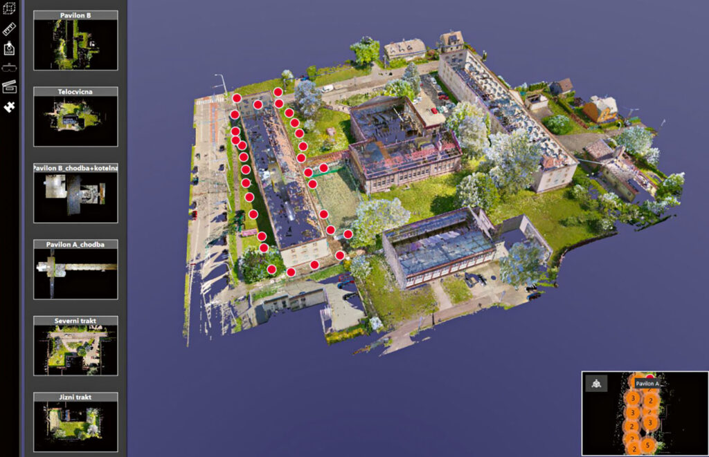 Slouží pro detailní skenování vnitřních i vnějších prostor s výstupem v podobě barevného mračna bodů a 360° fotografií. Využití: pasport současného stavu, podklady pro dodavatele dílenské dokumentace (prostorové zámečnické prvky, složité fasády, vestavný nábytek). - 360° kamery