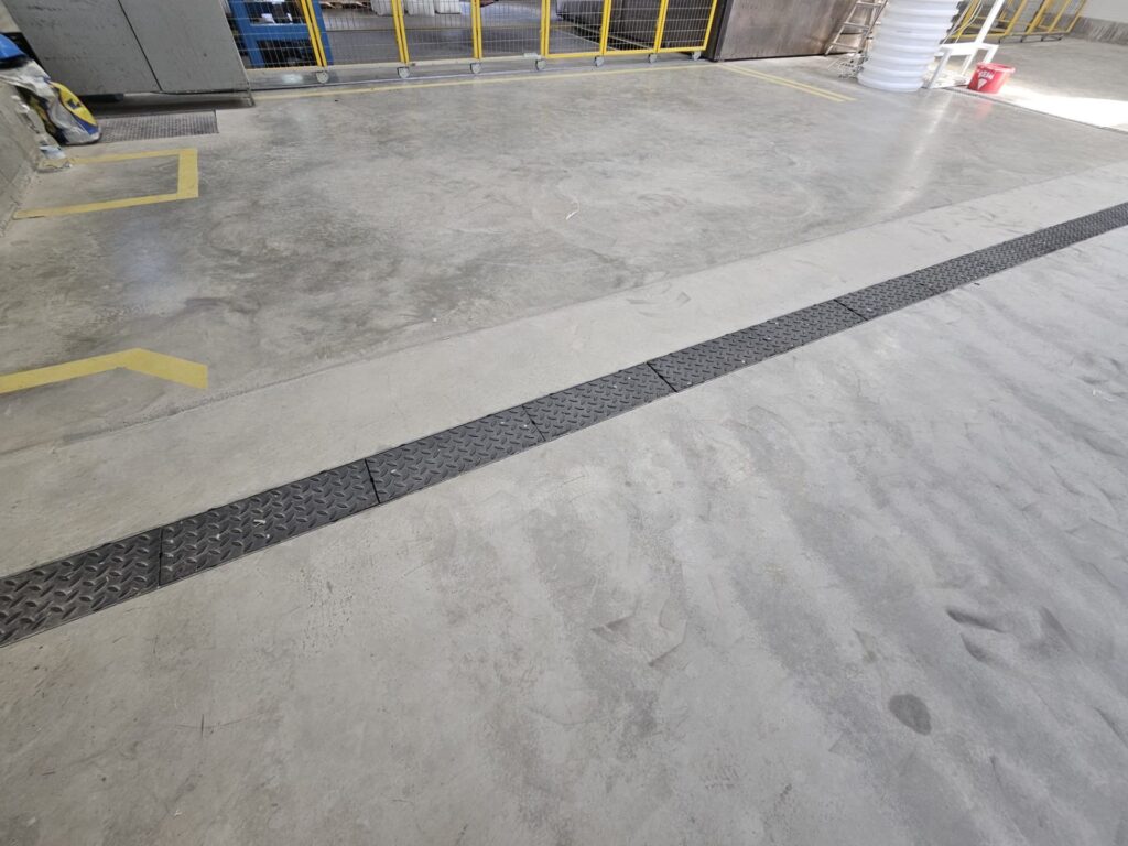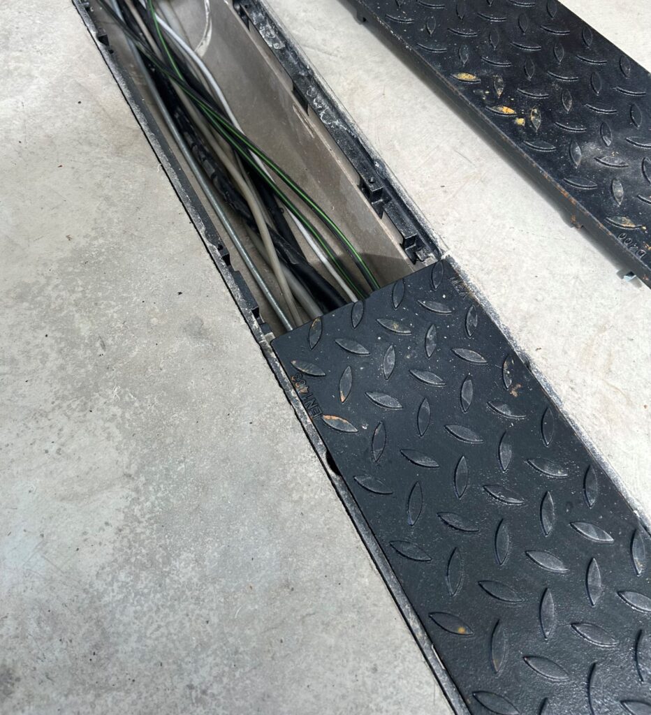 Kabely jsou vedeny ve žlabech z polymerického betonu EN 1500, které jsou zakryty plnými rošty Profix se zatížením D400 kN. Rošty tvoří funkci kabelových chrániček a vydrží i pojezd vysokozdvižných a paletových vozíků.