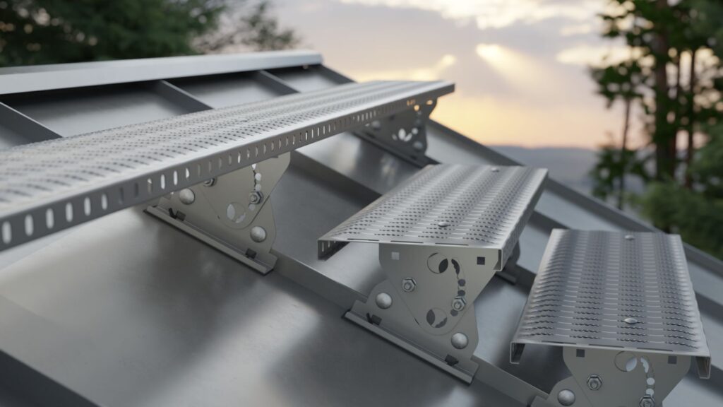 • Žebříky – Na střechu se montují do speciálních držáků, u kterých je nutné dodržet stanovené rozteče. Na žebřík se poté upevní nášlapy s protiskluzovou úpravou. Žebříky je možné podle potřeby zkracovat nebo nastavit více prvků za sebe, pokud je potřeba zpřístupnit i delší úsek střechy.