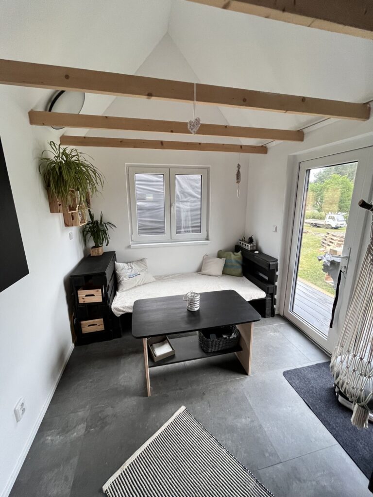 Interiér je s ohledem na prostor zařízen hlavně prakticky a účelně, důležitý byl také dostatek místa pro uložení všeho potřebného. V pravé části od vstupních dveří se nachází pohovka s konferenčním stolkem, v té levé je kuchyňská linka a velká skříň. Naproti ní je schodiště do patra, které zároveň slouží jako další úložný prostor. Místo se našlo i pro jídelní a zároveň pracovní stůl s židlí. V částí stavby, která slouží jako obývací pokoj, je ponechaný otevřený krov, ve druhé polovině je vytvořené patro na spaní s manželskou postelí a šatní skříní. Nábytek je zhotovený na míru od společnosti Můj ateliér z korpusu z laťovky s břízovou dýhou a dvířky z probarvené MDF desky. I ten si mladý stavebník vyráběl sám, ovšem za dohledu odborníků z firmy. V zadní části domu je pak vstup do koupelny s toaletou a sprchovým koutem, která je od obytného prostoru oddělená posuvnými dveřmi do pouzdra. Na většinu podlahové plochy byl položený vinyl, v koupelně pak dlažba.