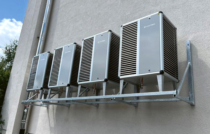 Navzdory tomu, že si spotřeba energie bytovky v Řeži vyžádala instalaci kaskády čtyř tepelných čerpadel, díky jejich umístění na boční stěnu domu nebylo třeba obsadit střechu, jak je někdy zvykem. A bytovka tak mezi okolními domy „vyniká“ pouze dvěma patry nástavby, kterou společenství vlastníků realizovalo už před lety. Subtilně působící boční instalace se podařilo dosáhnout díky volbě splitových tepelných čerpadel BA60IS z řady BoxAir Inverter Split od Master Therm s výkonem až 35 kW, která jsou uspořádána do kaskády s celkovým výkonem 140 kW (A7W35). To plně stačí pro bytový dům s tepelnou ztrátou 100 kW. Vnější jednotky jsou kompaktní, usazené na stěně na speciální konzoli a vzhledem k absenci kompresorů i velmi tiché, lehké a bez vibrací. Instalace ve výšce poskytuje ochranu proti vandalům nebo krádeži, a navíc díky ní není nutné vlastnit pozemek určený k umístění jednotek.