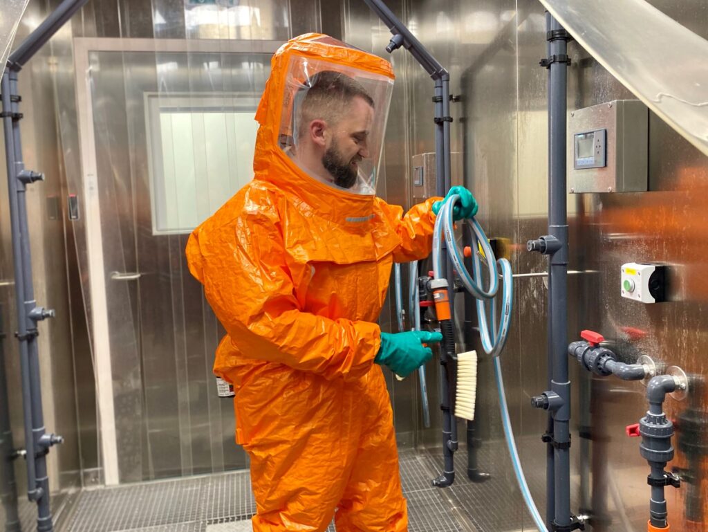 Součástí prostor jsou komory s dekontaminační sprchou, kde si ošetřující personál provádí oplach ochranného oděvu vodou s dezinfekčním prostředkem. Oplachová voda odtéká do nerezové vany a nerezovým odpadem do dekontaminační jednotky, kde se dále vysterilizuje a „převaří“.