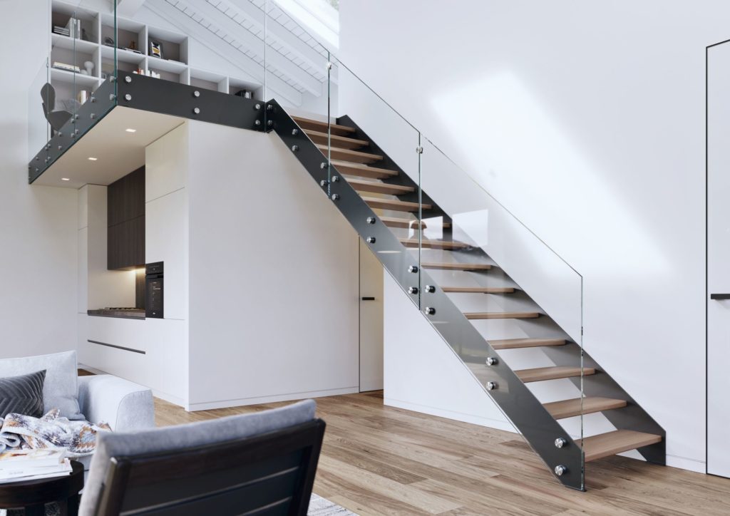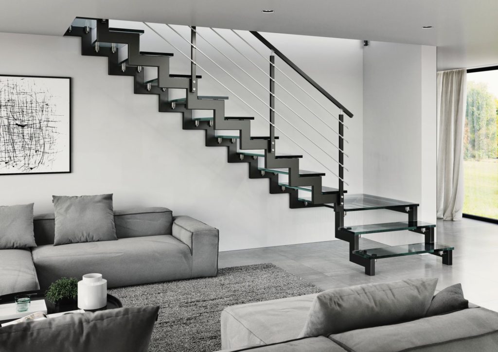 Bočnicové schodiště se v interiéru vyjímá svou lehkostí a elegancí, protože nosnou konstrukci schodiště tvoří pouze kovové bočnice.