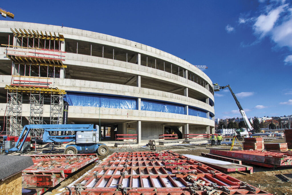 Z hlediska konstrukce hraje beton zásadní roli v každé fázi výstavby. Objekt má dvě podzemní a šest nadzemních podlaží. Podzemní části jsou kompletně monolitické – železobetonové stěny a stropy zde tvoří robustní základ pro zatížení nadzemních konstrukcí, a zároveň slouží jako obal pro technické a provozní zázemí haly. Pro tyto části bylo navrženo využití vysocepevnostního betonu s důrazem na vodotěsnost a dlouhodobou trvanlivost.