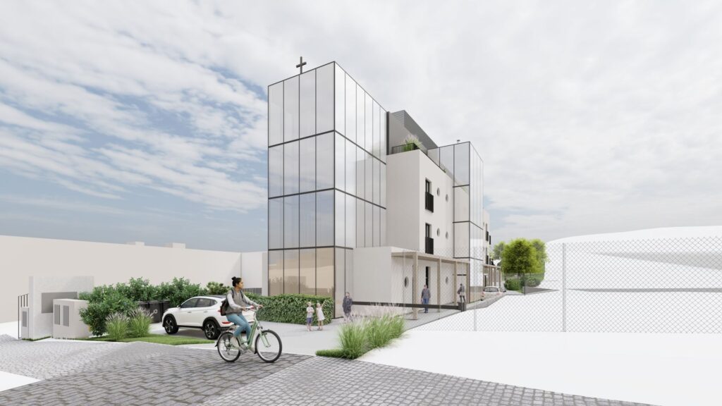 „Navrhovaný objekt se nemusí ke svému okolí vymezovat, stačí, když bude silný a jedinečný. Hrdá loď, která je sama sebou, se ani nevyvyšuje, ani není ušlápnutá. Do ulice jako zvěst, že život je konečný a že je zde síla, která nás převyšuje, je umístěna nehmotná skleněná proměnlivá fasáda kaple. Ta ve vyšších patrech navazuje na spirituální místo – klidná část jídelny,“ popisuje autor studie stavby, architekt David Vávra.