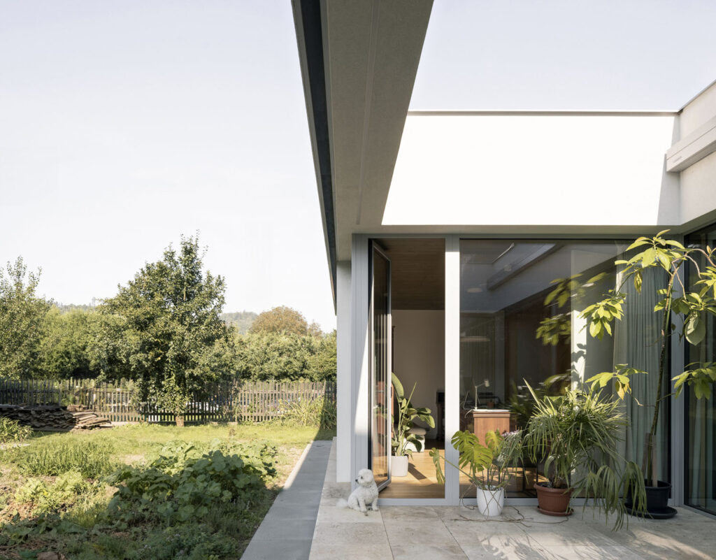V údolí zelených kopců nedaleko hradu Pernštejn vznikl dům, který spojuje bydlení s krásou okolní přírody. Jeho koncept a tvar utvářejí čtyři zelená atria a čtyři boxy zázemí. Podoba atrií hrála v návrhu klíčovou roli – jejich posunutí ze středu na obvod stavby vpouští do interiérů světlo, přesto zachovalo intimitu řešení.