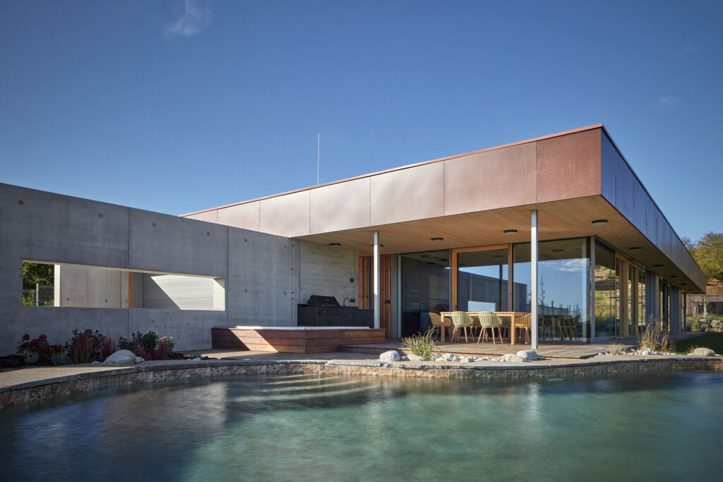 Všechny obytné místnosti obepínají terasy, přesah střechy je kryje před deštěm a letním sluncem. U hlavní terasy je koupací jezírko, které stejně jako vegetační střecha upravuje klima v teplých dnech. Druhá terasa nabízí zapuštěný bazén s venkovní sprchou. Za domem se nachází zahrada, která přechází v ovocný sad, zakončený objektem pro hosty a zázemím. Přesto, že je dům poměrně velký, působí nenápadně.