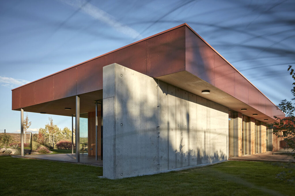 Modré hory jsou krásným místem pro rodinný dům, pozemek se navíc nachází v blízkosti vinic a meruňkových sadů. Dřevostavba má plochou, zelení porostlou střechu, její obvodové stěny se budovaly z masivních CLT panelů. Zatepleny jsou kombinací minerální vaty a dřevovláknité izolace. Fasádu tvoří kombinace betonu a dřevěných hranolů, atika je obložena deskami z kortenu.