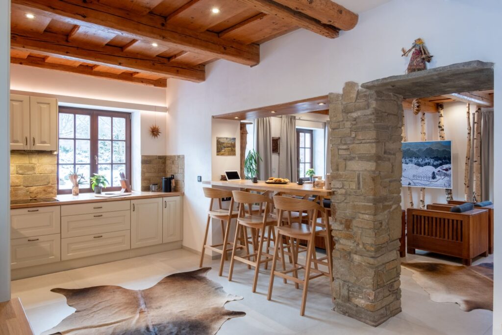 Interiér propojuje architekturu a přírodou, celý dům prolínají přírodní barvy i materiály. Dřevo bylo použito v podobě ručně tesaných, překládaných trámových stropů i v přírodní formě neopracovaných kmenů. „Jako propojující prvek mezi interiérem a exteriérem jsme na schodišti zvolili březové kmeny. Majitel se jimi natolik nadchnul, že jsme je zakomponovali i do dalších místností.,“ popisuje Ing. arch. Filip Ciahotný. Přírodní podoba dřeva ale svoji podstatnou roli hraje také na nábytkovém vybavení, které do interiéru dodávala místní firma Valoverda Friends, zaměřující se na designový nábytek.
