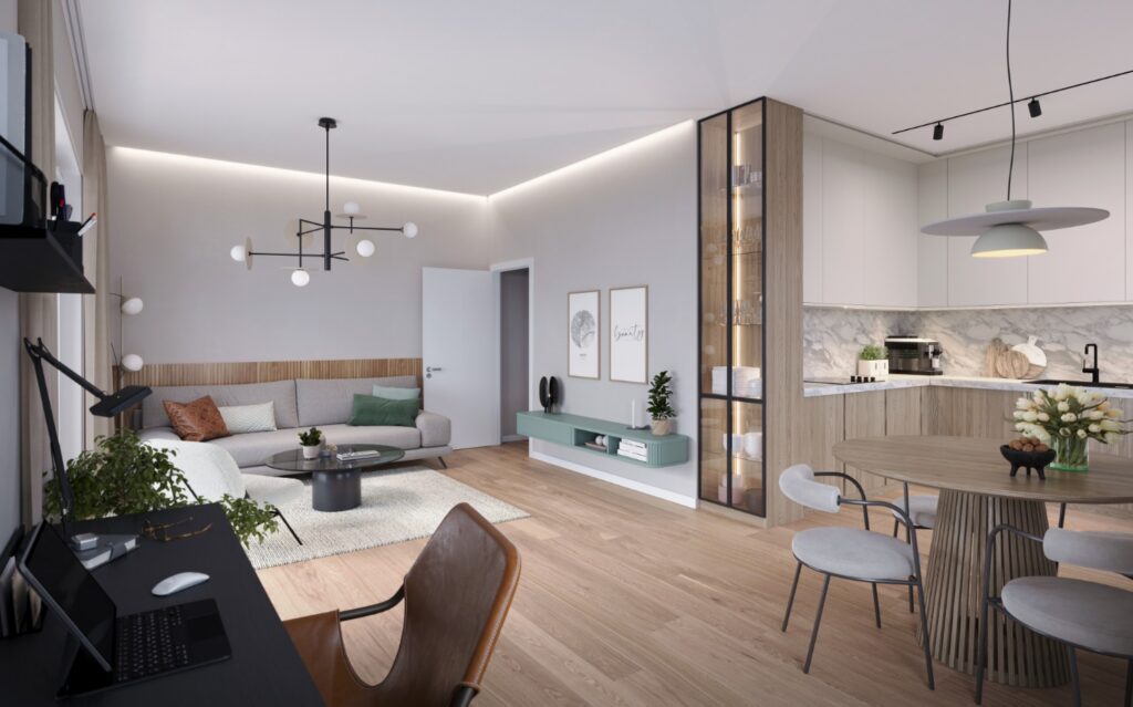 Interiérový design nových bytů je moderní a promyšlený, s důrazem na praktičnost a efektivní využití prostoru. Vysoký standard potvrzují kvalitní prvky, jako jsou elegantní vyšší dveře, třívrstvé dřevěné podlahy a kvalitní sanitární vybavení. Zároveň projekt dbá na využití zdravých a udržitelných materiálů s certifikacemi EPD, FSC a PEFC. Součástí standardní výbavy je také propracovaný systém Smart Home nebo chytrý videotelefon, který umožňuje pohodlné ovládání vchodových dveří, přivolání výtahu apod.