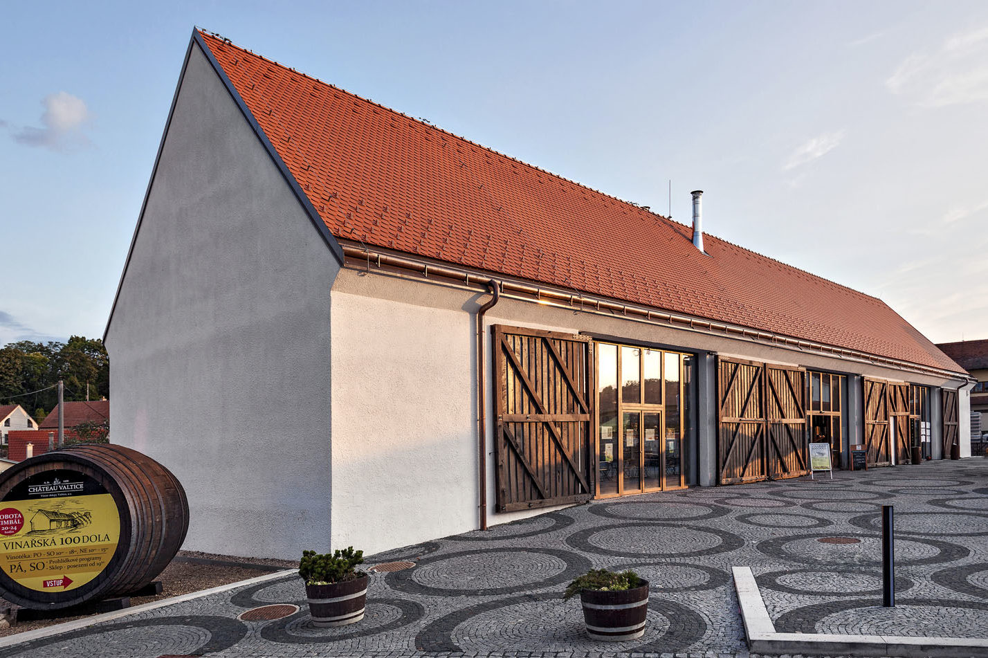 Vinařská stodola ve své pokorné a konzervativní architektuře objevila půvab tradičního tvarosloví a kompozičních principů. Společně s ní bylo obnoveno přilehlé náměstí, které doplňuje osvětlená fontána. Z druhé strany stodoly je parková úprava s volně protékajícím vodním prvkem. Ústí do jezírka s molem, u něhož se nachází výstup z degustačního sklepa. Pod náměstím se skrývá kruhový chrám vína s podzemní rotundou a okulusem, symbolizující Boží oko a prozřetelnost.
