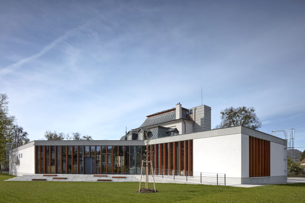 Přístavba je řešená jako železobetonový skelet s ocelovými sloupy a zdivem s izolační výplní. Díky tomu mohou interiéry volně plynout a těžit z velkorysého propojení se zahradou i veřejným prostorem. Důležitým parametrem, který ovlivnil podobu přístavby, je velmi nízká energetická náročnost stavby. Z ní vycházela kombinace stavebních a technologických prvků: zelená střecha omezuje přehřívání a zlepšuje zadržení dešťové vody na pozemku. Přesah střechy stíní prosklenou fasádu na západě, samotná prosklená fasáda je z kvalitního trojitého zasklení plněného argonem. Vytápění i chlazení zajišťuje tepelné čerpadlo země/voda se třemi zemními vrty pod budovou. Aby bylo možné budovu tepelným čerpadlem chladit v letních měsících, je topné a chladící potrubí rozvedené ve stropě.