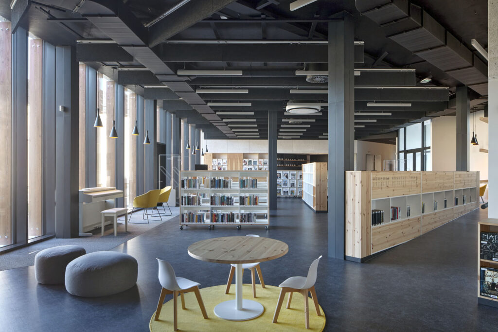 Na jednu stranu to umožnilo naprostou variabilitu uspořádání nábytku v přístavbě, na druhé straně si to vyžádalo technicistní pojetí nezakrytého stropu a použití svislých stropních akustických prvků – bafflí. Interiéru to dodává pravidelný rytmus, který se opakuje ve svislých fasádních trámech i v pravidelném členění regálů podél stěn.