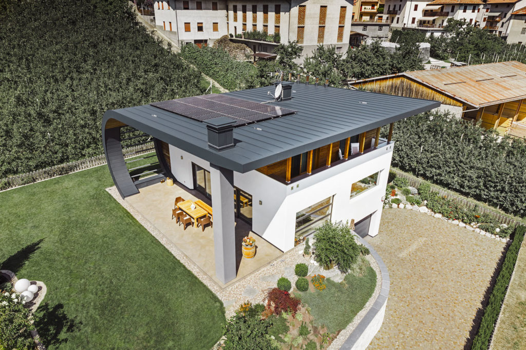 Dostat jedinečný nápad je bezesporu obdivuhodné a fascinující. Avšak mnohdy je ještě těžší o takovém nápadu a jeho kvalitách přesvědčit i široké okolí. Že to není nemožné, ukazuje realizace rodinného domu v obci Flavon, v severoitalském Trentinu. Tradiční lokální výstavbu oživuje neobyčejný projekt oválné budovy, kterou chrání hliníková střecha přecházející ve fasádu připomínající široké písmeno C. Neobyčejnost je ještě podtržena šesti dřevěnými sloupy, které střechu protínají a opticky zdánlivě podpírají.