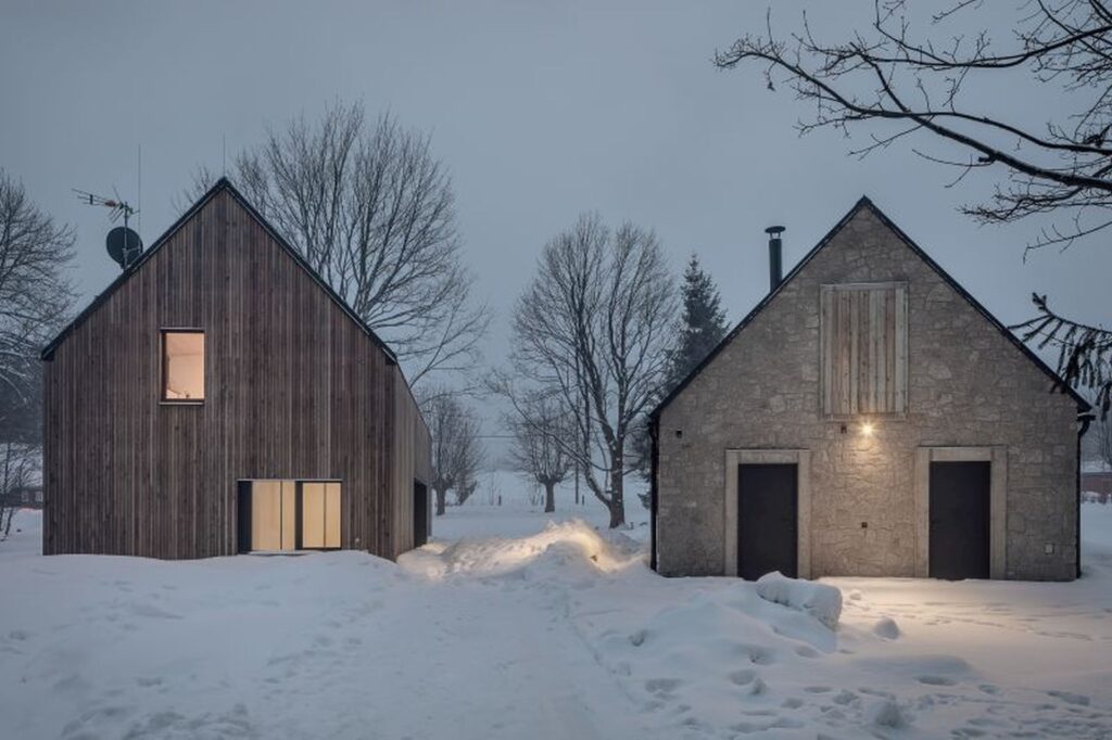 Jeden obytný dům a stavení připomínající stodolu. Uprostřed Jizerských hor společně vytvářejí ideální domov pro víkendový útěk z města i ke stálému obývání. Celý koncept je zdárným příkladem toho, že i moderní stavby pojaté s pokorou dokážou harmonicky splynout s tradičním horským prostředím a nenarušovat ráz okolní krajiny.