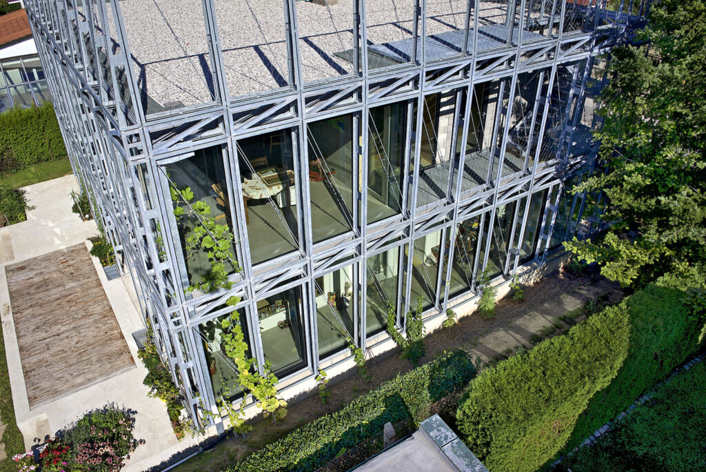 Dům byl postaven ve třicátých letech 20. století, pak byl několikrát dostavován a přestavován. Vzhledem k těmto zásahům přestala být jeho stabilita dostatečná. Základním rozhodnutím tedy bylo doplnit a ztužit jeho konstrukci ocelovým korzetem. Není pouze technickým prvkem, slouží také jako treláž pro rostliny, po architektonické stránce objekt sceluje.