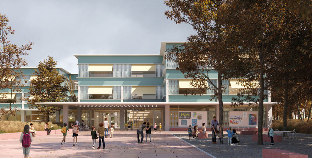 Školní areál vznikne ve východní části města, kde se stane centrem vzdělávání, kultury a sportu. Nízkopodlažní budova bude z části veřejně přístupná, ale zároveň školu odděluje od veřejného prostoru a zajistí tak bezpečné prostředí. Lineární nízkopodlažní strukturu budovy architekti doplnili vertikálními zelenými atrii. Vnitřní prostor kombinuje vzdělávací, sportovní a kulturní prvky bez jasných hranic.