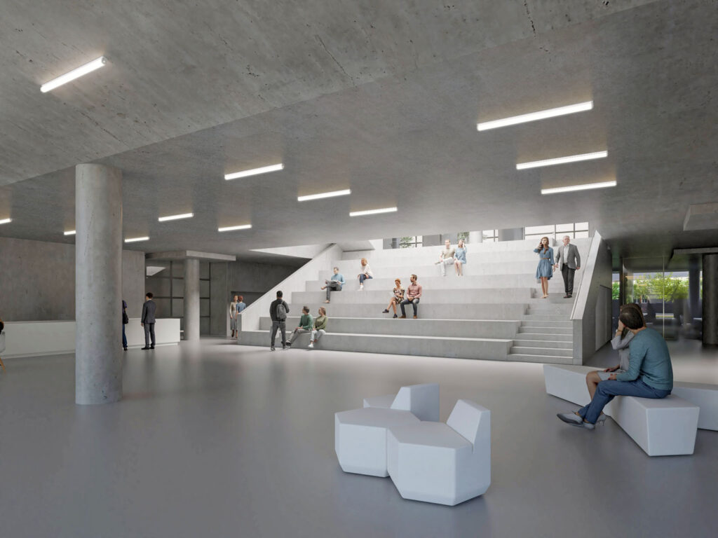Přízemí budovy je koncipováno jako velkorysý společenský prostor, který nabízí svou plochu pro různá využití. Široce prosklenou fasádou se otevírá k jihu a rozšiřuje se tak o parter ulice. „Abychom plochu vstupní haly o nejvíce uvolnili, umístili jsme hmotu velké posluchárny do 2. NP. Její stupňovitá podlaha se zvedá k jižní fasádě a otevírá tak pohledy do korun stromů před školou. Součástí haly je recepce, pult se zázemím pro občerstvení, široké pobytové schodiště s blokem skladu, šaten a toalet. Za recepcí je umístěn blok výtahů a schodiště. V jihozápadním rohu budovy z ulice Ruská je vjezd s rampou do podzemního parkoviště. Abychom posílili transparentnost přízemí, ponechali jsme vjezd v této části prosklený s pohledem do zeleně,“ dodává Lukáš Ehl.