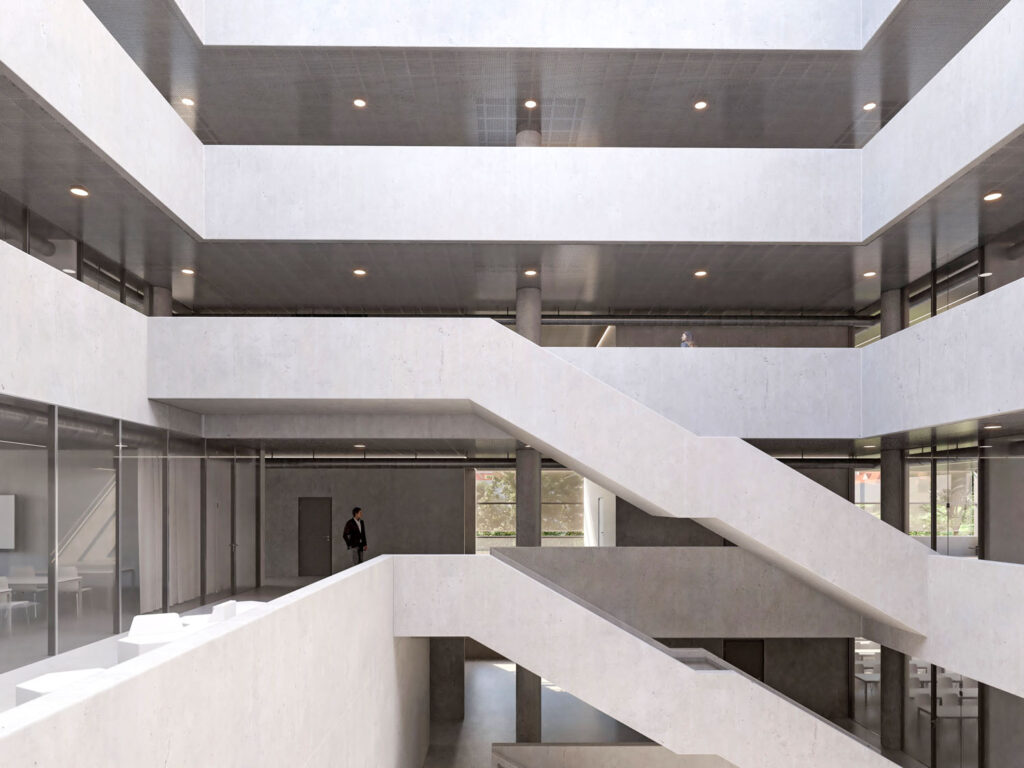 „Hlubokou dispozici prosvětluje atrium s otevřenými galeriemi. Členěna je čtyřmi uzavřenými bloky komunikačních a sanitárních jader, které vymezují volnou plochu učeben a zázemí pedagogů. Tyto prostory budou dobře prosvětlené díky prosklené fasádě a proskleným stěnám do atria. Učebny mají možnost zatemnění pomocí elektricky ovládaných textilních závěsů. V horním ustoupeném podlaží bude knihovna s pobytovou střešní zahradou a solární střechou. Prosklené fasády výukového pavilonu stíní systém předsazených rolet, které během dne reagují na změnu intenzity přímého slunečního záření,“ uvádí architekt Tomáš Koumar.
