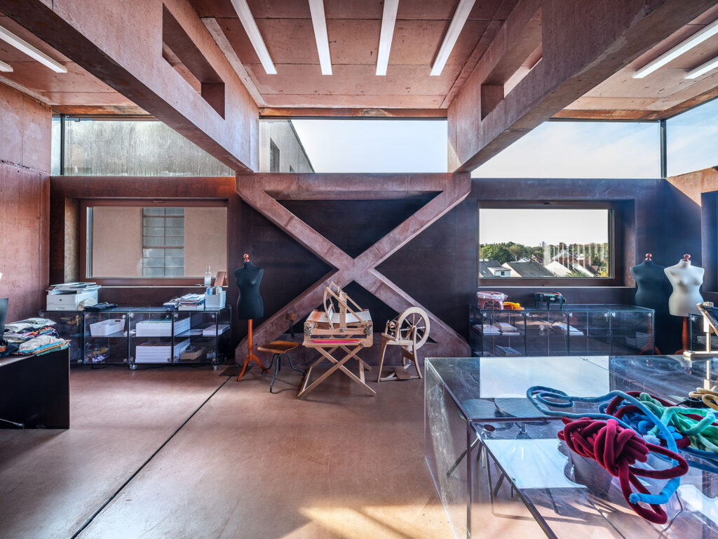 Konstrukce dílen je založena na nosných betonových žebrech v rastru 3 × 3 metry, která podepírají na krajích při fasádě X-nosníky. Překlenout devítimetrové rozpony pomohly metrové nosníky s otvory, jež umožňují instalovat rozvody přiznané v interiéru. Učebny tak nemusejí mít další vnitřní podpory. X-nosníky jsou jakousi hybridní perforovanou stěnou, která zároveň zavětruje celou stavbu po obvodu. Zvenku jsou umístěny lehké panely se zateplením, kryté cortenovým plechem.