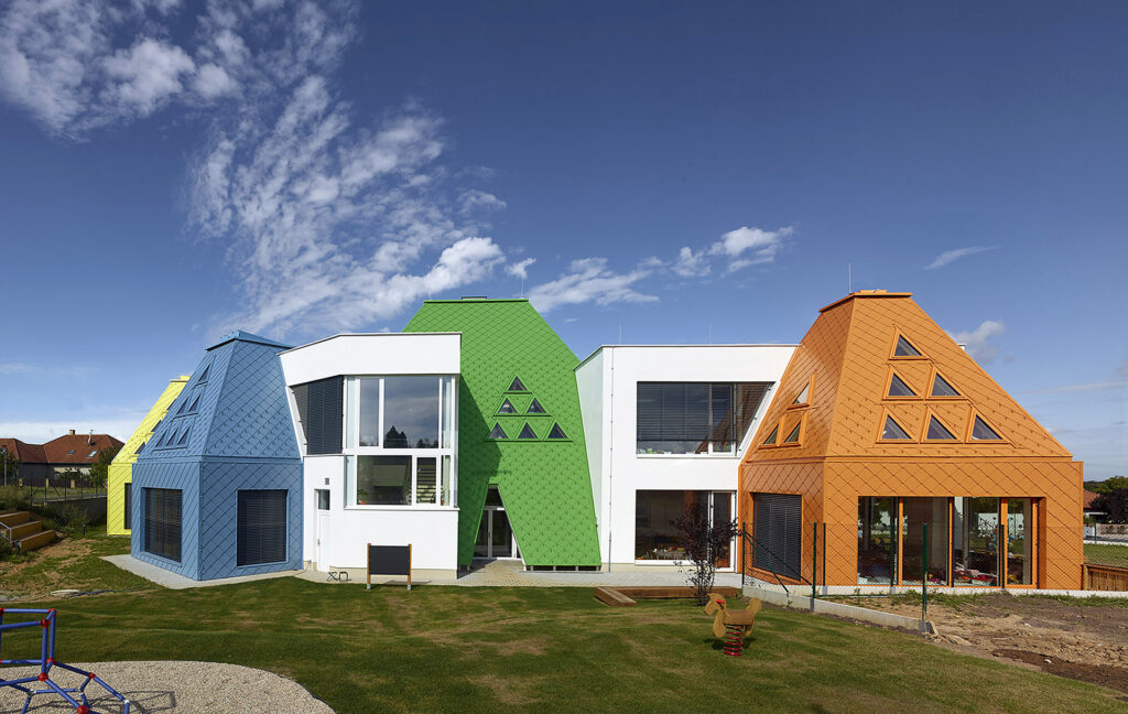 Zadáním města bylo navrhnout novostavbu školky se sportovním zaměřením. Její tělocvična jednou bude sloužit i veřejnosti, zatím byla postavena mateřská škola. Tvoří ji rozehraná kombinace pravoúhlé stavby s bílou fasádou a barevných pagod. Je zřejmé, že pro její autory byly nejdůležitější děti – jejich hry, pohyb, vidění, měřítko, vnímání světla a prostoru. Dětská živelnost a nepředvídatelnost, čistota a zvídavost.