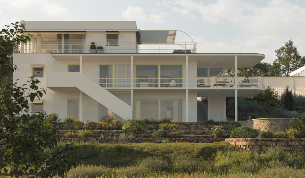 Součástí úkolu bylo jižní fasádu doplnit o venkovní pobytové terasy, které slouží jako rozšíření vnitřních obytných ploch a zastíní je před slunečními paprsky. Navíc při zatažené obloze umožňují venkovní sezení a ochranu před deštěm. Vzniká také nová pobytová střecha, jakožto penthouse, tzv. ložnicové patro.