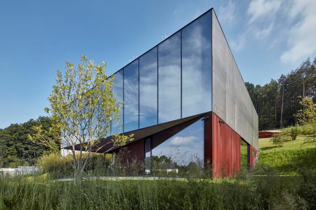 Dům má čtvercový půdorys s pootočením dispozice uvnitř pláště. Vnějšek respektuje vrstevnicovou logiku okolních staveb, interiéry se ale přitáčejí k městu. Sokl spodního podlaží je zapuštěný do svahu, na něj autor nasadil skleněný hranol obytného podlaží.