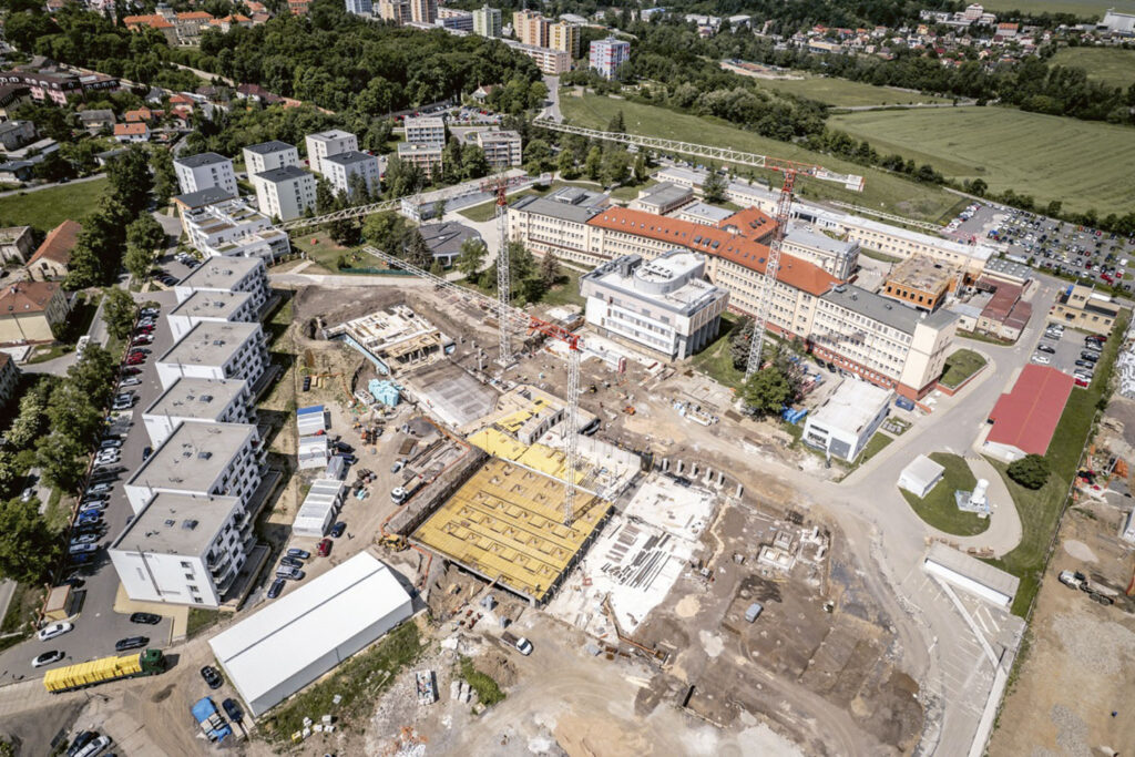 Výstavba projektu Nemocnice nové generace byla zahájena v srpnu 2021 rozsáhlými zemními pracemi. Při hloubení stavební jámy bylo nutné zajistit terén pomocí záporového pažení a odtěžit přibližně 50 tisíc m³ zeminy. Budova je založena na hlubinných pilotech o délce 6 až 15 metrů, které zajistily stabilitu stavby na různorodém podloží. „Bylo odvrtáno 300 pilot. Jen pilotování nám zabralo zhruba půl roku při nasazení dvou vrtných souprav současně,“ vysvětluje Marek Paulis, projektový manažer společnosti CONSTRUCTION TEAM.