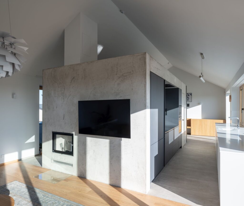 Chlad betonové stěrky, použité na obývací stěně a okolí schodiště, opět zjemňují prvky ze světlého dřeva, zejména podlaha v obývací zóně a rozložité posezení v jídelně. Výše stropu a četné prosklené plochy zabraňují pocitu stísněnosti, velkou výhodou je možnost využití venkovních teras, vyvýšených nad úroveň zahrady. Vybavení teras odpovídá prostoru, na nějž navazují – větší z nich, s průchodem z obývací části, je vybavena jako obývací pokoj, zatímco menší, vycházející z jídelny, zase jako jídelní prostor. Nabízejí se tak jako sofistikované řešení skromných rozměrů vnitřního zázemí a odpovídají záměru propojení s přírodou, aplikovaného při tvorbě atria i zahrady. Pro chladné a deštivé dny je potom uvnitř připraveno široké posezení u krbu, který zajistí nejen potřebné teplo, ale i dokonalou atmosféru zasněženého zimního dne.