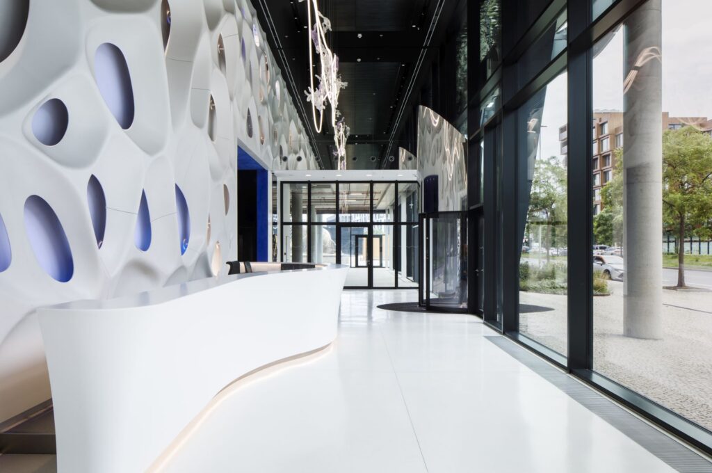 Záměrem architektky Evy Jiřičné a jejího kolegy architekta Petra Vágnera z ateliéru AI – DESIGN bylo vytvořit originální a transparentní objekt, což umožňuje celoskleněná fasáda. Rukopis Evy Jiřičné je vepsán i do vstupního lobby, kde na první pohled zaujme bionická podsvětlená stěna z Corianu, navazující na monumentální recepční pult. Moderní plastiky vyrobilo brněnské studio A.M.O.S. DESIGN dle návrhu architekty Evy Jiřičné. Ta do modelování stěny zapojila i umělou inteligenci. Profilovanou stěnu doplňuje skleněná svítící plastika od sklářské společnosti Lasvit. I tento objekt navrhla Eva Jiřičná. Všechny tři prvky (bionická stěna, recepční pult a plastika) jsou inspirovány vodou jako základem života (bubliny ve stěně, vlna recepčního pultu, prýštící voda v lustru) a navazují tak na slunolamy ve tvaru vln na jižní fasádě Arché.