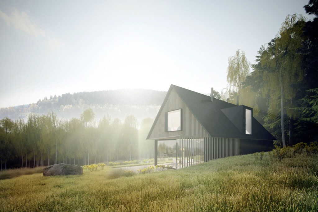 Dům stojí na samotě u Hodslavského potoka nedaleko Vyššího Brodu. Jeho autorem je architekt Vojtěch Lichý, se základní rozvahou technologií mu pomáhal Petr Pávek. „Chtěli jsme pokorný, poctivý domek s dlouhou životností. I proto jsme se rozhodli pro celokeramickou variantu s cihlami Porotherm T-Profi. Cihly jsou naplněné izolací, minimalizují tak spotřebu energie a pomáhají udržovat tepelný komfort v zimě i v létě, navíc všechny pocházejí z České republiky. Největším oříškem je ale rozchodit dům bez přítomnosti inženýrských sítí. Na to už byl potřeba široký technický tým,“ uvádí Pavel Podruh, zakladatel projektu Český soběstačný dům.